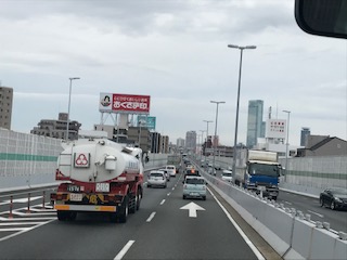 少し渋滞しています。文の里あたりです。奥にハルカスが見えます。 到着が10分程遅れそうです。