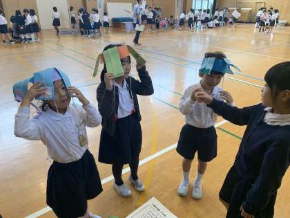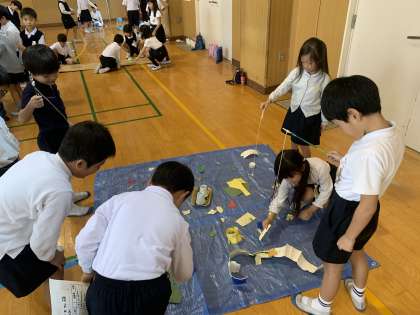 今日は、講堂でおもちゃまつりをしました。生活科の学習で作った手作りおもちゃを1年生に遊んでもらいました。お店の人になりきって、一生懸命頑張っていました。最後には、2年生で育てて作ったサツマイモの茶巾絞りをプレゼントしました。