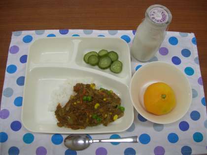 ドライカレー、きゅうりのサラダ、みかん、牛乳
