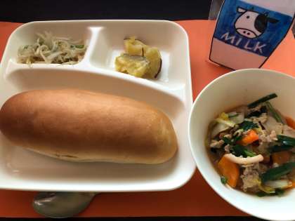 豚肉といかの中華煮 焼きさつまいものあまみつかけ もやしとピーマンの炒めもの 黒糖パン 牛乳