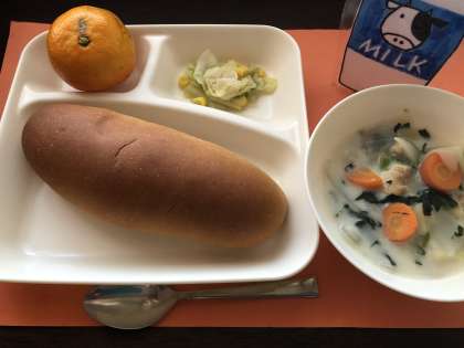 クリームシチューはホタテの貝柱が入っています。ホワイトルウは給食室で小麦粉を炒って作った手作りです。子どもたちに大人気です。今日も無事おいしい給食をいただくことができました。