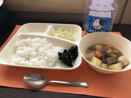 「のりのつくだ煮」は、きざみのりとしいたけを砂糖としょうゆで煮ています。給食室での手作りです。大きな釜でじっくり炊いた「関東煮」も、子どもたちはとてもおいしかったようです。