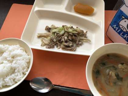 豚肉とまいたけのいためもの つみれ汁 かぼちゃういろう ごはん 牛乳