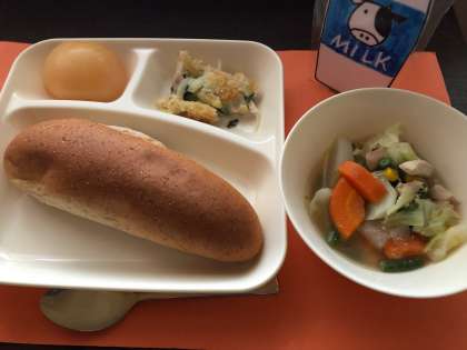 今日のスープ煮は、だいこん にんじん など冬野菜が入ってあたたまるおかずでした。ライ麦パンはライ麦粉が混ぜ込まれて香ばしいパンです。もものかん詰めをデザートに、今日もおいしい給食をいただくことができました。