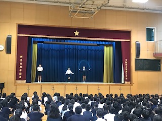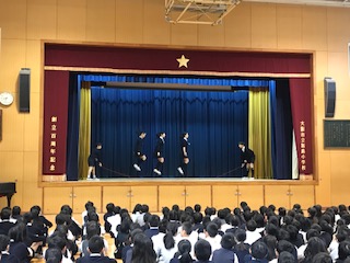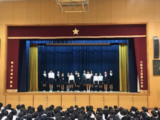 今週から12月13日まで、なわとび週間となっています。これから3回にわたって、体育集会は、なわとびの跳び方の説明をします。今日は、運動委員会の子たちが、低学年向けの跳び方をいろいろと教えてくれました。