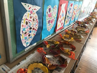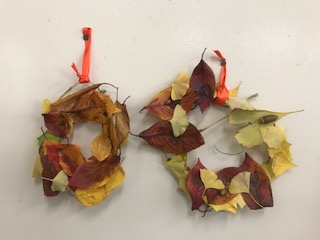 2年生は昨日、下福島公園へ秋さがしに行きました。色とりどりの落ち葉やどんぐりをたくさん拾いました。学校に戻ってきてから、それを使って、リース作りをしました。すてきなリースができあがりました。