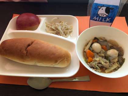 「八宝菜」には、はくさい 玉ねぎ ピーマン にんじん キャベツ たけのこ しいたけ うずら卵 豚肉 と、様々な具が入っています。 皮付きりんごもあり、今日も栄養たっぷりの給食を無事いただくことができました。