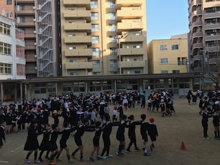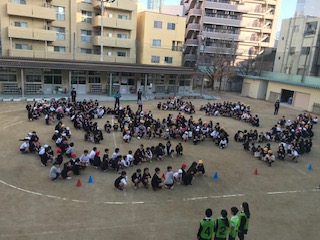 今朝の児童集会は。「じゃんけん列車」をしました。運動場で大きく動き回り、じゃんけんをしながら、長い列を作っていきました。最後まで勝ち残った子は、みんなから大きな拍手をしてもらえました。