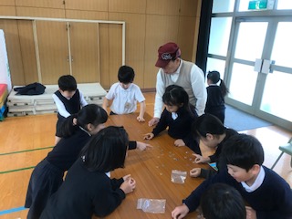 本日(15日)の2,3時間目に、1年生は講堂で「むかしあそび」を行いました。地域の寿老会の皆さんと一緒に、昔遊びを楽しみました。竹とんぼ、コマ、けん玉、まりつき、あやとり、お手玉、おはじき、はねつきの8つのコーナーをまわりました。