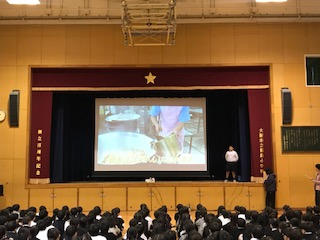 先日、委員会で学習した「みるく教室」について、クイズを取り入れながらわかりやすく紹介してくれました。その後、給食ができるまでの様子をビデオで見ました。いつもは見ることのできない給食調理室の様子でしたので、子ども達はとても興味津々でした。来週の給食週間について、校長先生からのお話もありました。