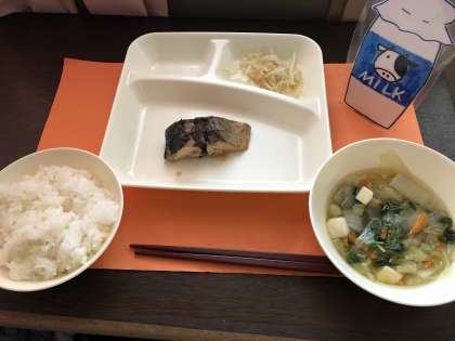さばのみそ煮 すまし汁 もやしのゆずの香あえ ごはん 牛乳