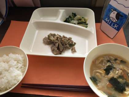 豚肉のごまだれ焼き みそ汁 きくなとはくさいのおひたし ごはん 牛乳