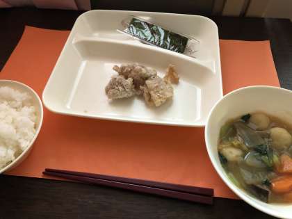「やったー!からあげや!」と歓声が上がるほど大好きな「鶏肉のから揚げ」に「野菜のうま煮」と「焼きのり」がついて、とてもご飯のすすむ給食を、今日もおいしくいただくことができました。