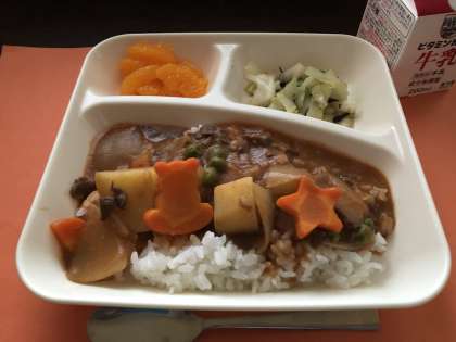 今日の「ハヤシライス」はラッキー人参入りです。酸味の効いた「キャベツのひじきドレッシング」と、甘い「みかん」で食べやすく、今日も楽しくおいしい給食をいただくことができました。