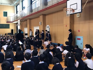21日の児童集会は、今年度最後の児童集会でした。集会委員の子達はこの1年間、楽しいゲームを考えて、集会を盛り上げてくれました。その日は、たてわり班で1列に並び、伝言ゲームをしました。ほとんどの班は、言葉が変わってしまいましたが、3つの班はばっちり最後までまちがわずに言葉を伝言することができました。