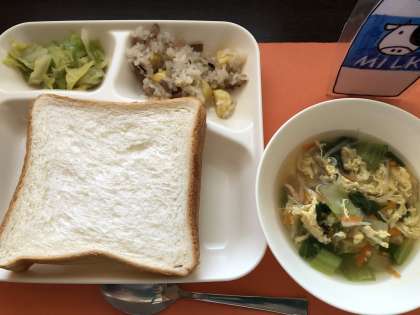 中華おこわ 卵スープ キャベツのオイスターいため 食パン マーガリン 牛乳