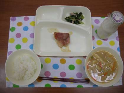 赤魚のしょうゆだれかけ、みそ汁、こまつなの煮びたし、ごはん、牛乳