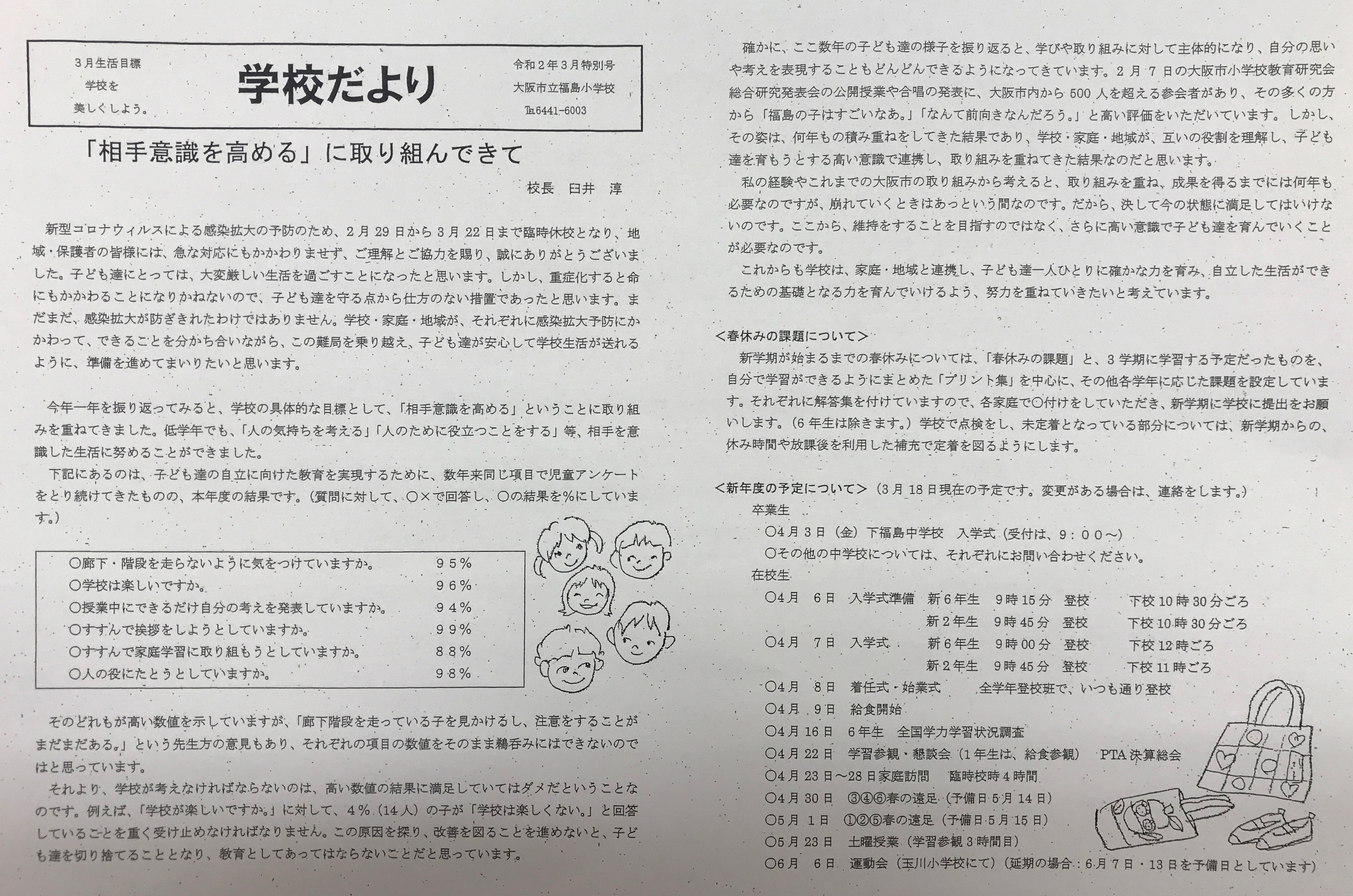 学校だより3月特別号を配布文書に掲載しましたので、ご覧ください。今月は、児童の作文を裏面に載せています。