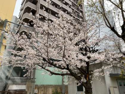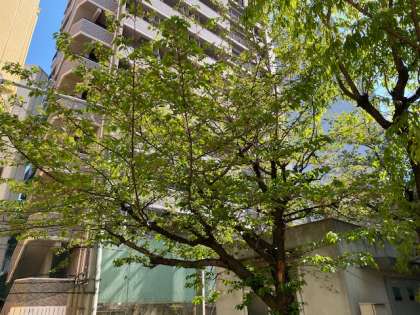 4月のさいしょのころには、まんかいの花がさいていたサクラも、今は、すっかりみどりの葉におおわれています。校庭のツツジがきれいにさいています。