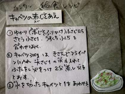簡単レシピ6回目は、「キャベツの赤じそあえ」です。色どりがきれいな一品です。