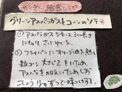 今回のカンタン給食レシピは「グリーンアスパラガスとコーンのソテー」です。アスパラガスは、今が旬ですね。見かけたらぜひ使ってみてください。