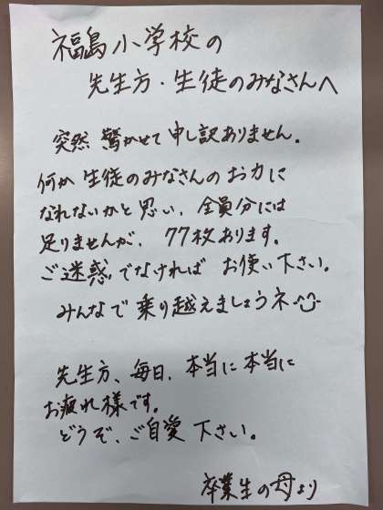 今日、本校卒業生の保護者の方から、手作りマスク77枚をいただきました。温かい心遣いに、教職員一同とても感謝しています。大事に使わせてもらいます。ありがとうございました。