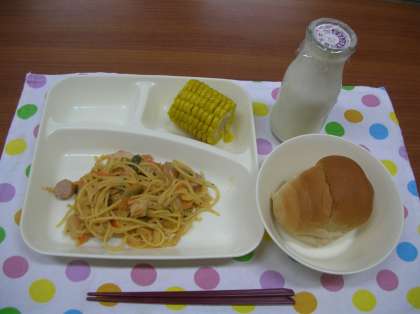 「蒸しとうもろこし」は、1本の1/3ぐらいの大きさの冷凍コーンを30分間、焼き物機で蒸しました。とてもあまくておいしかったのですが、前歯の間によくはさまるので歯磨きが大変だったようです。(栄養教諭)