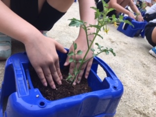 植木鉢の土の真ん中に穴をあけて、小さい手で苗を大切に包んで、植えました。