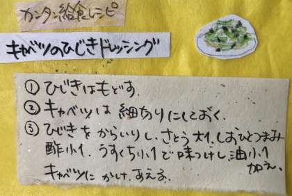 今回のカンタン給食レシピは「キャベツのひじきドレッシング」です。手作りドレッシングです。いろいろと応用できそうですね。