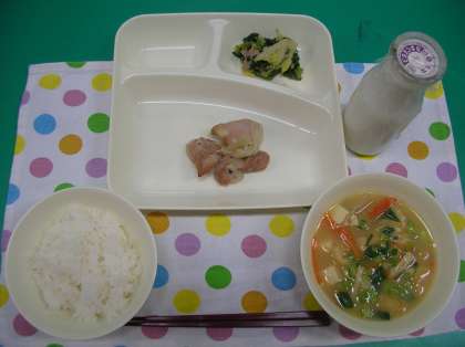 鶏肉のゆず塩焼き、みそ汁、はくさいとほうれん草の煮びたし、ごはん、牛乳