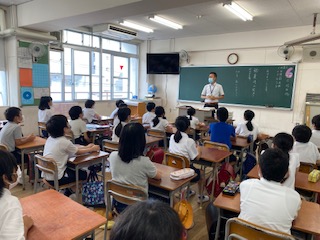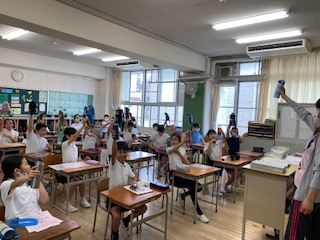 5年生の様子です。久しぶりの再会を喜んで、水筒で乾杯しました。