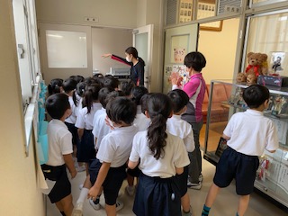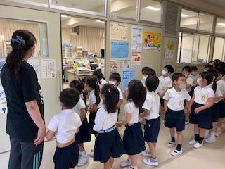 本日1,2時間目に、1年生は学校たんけんをしました。担任の先生から、学校の中のいろんな教室を教えてもらいました。初めて見る音楽室や理科室などに興味津々でした。校長室にも入らせてもらい、子どもたちはとても大喜びでした。