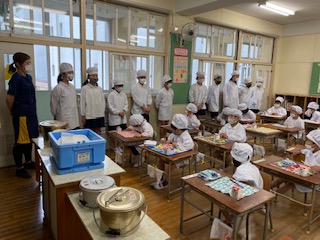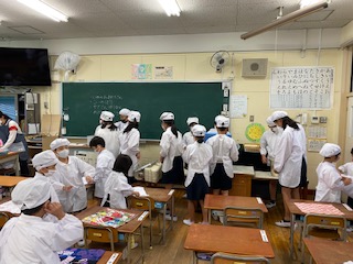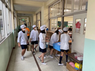 給食が始まってから今日まで、6年生の子達が1年生の給食のお手伝いをしてくれました。給食を運ぶだけでなく、1年生の子達の身支度の準備まで、優しく手伝ってくれました。来週からは、1年生だけで準備、片づけを行います。がんばってくださいね。
