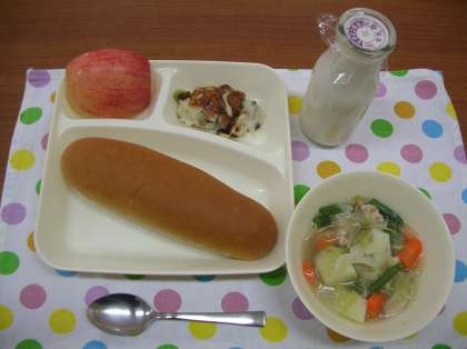 鶏肉とじゃがいものスープ煮、きのこのドリア、りんご、黒糖パン、牛乳