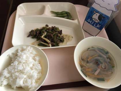 チンジャオニューロウスー ハムと野菜の中華スープ えだまめ ごはん 牛乳