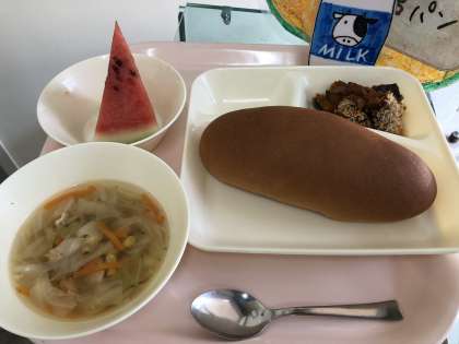 かぼちゃのミートグラタン スープ すいか 黒糖パン 牛乳