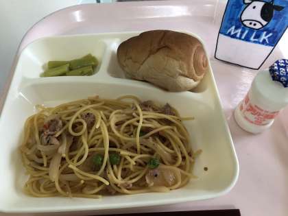 あっさり味の「スパゲッティ」はいつも通り好評です。「アスパラガスのサラダ」は、警戒しつつ、でもがんばってチャレンジしたら「おいしい!」と言って全部食べちゃう子どもも数人見かけました。