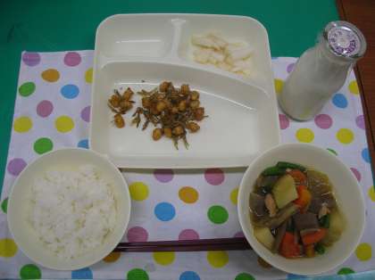 鶏肉と野菜の煮もの、じゃこ豆、かぶのゆず風味、ごはん、牛乳
