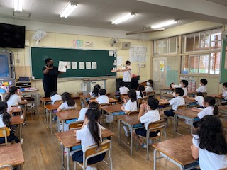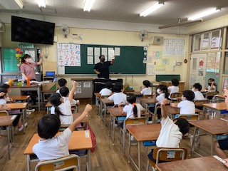 C-NETの先生と英語の学習が行われました。1年生にとっては初めての学習でしたので、とても大喜びで、Donique先生と楽しく「I'm good.」や「I'm happy.」などの感情を表す言葉を覚えました。