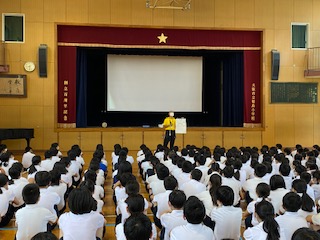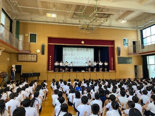 今朝の児童朝会で、代表委員会の子達から、学校のめあての発表がありました。今年のめあては「みんな一生けん命!助け合い!ニコニコあふれる学校にしよう!」です。みんなが笑顔になれる学校をめざしてがんばりましょう!!