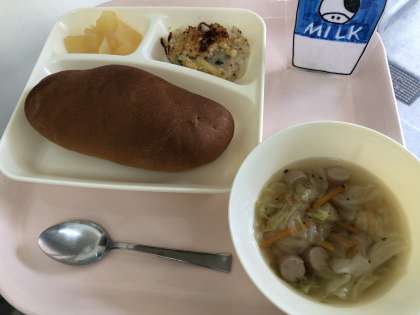 黒糖パン マカロニグラタン スープ りんご(カット缶) 牛乳