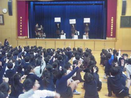 今日(12日)の集会は、放送委員会の発表でした。委員会の仕事や普段放送している内容や音楽について、クイズ形式にして発表しました。クイズの正解が発表されるたび、「やったー!」と賑やかな声が講堂に響いていました。