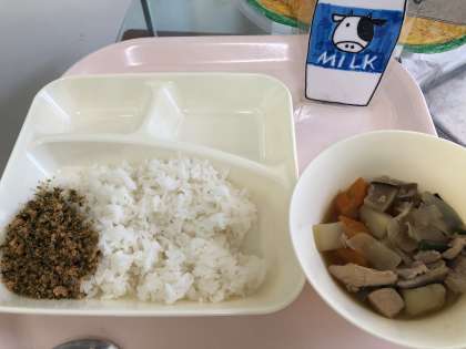 鶏肉とじゃかいもの煮もの 紅ざけそぼろ ごはん 牛乳