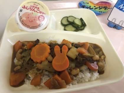 牛肉と大豆のカレーライス(米粉) きゅうりのピクルス りんごゼリー 牛乳