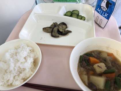 『肉じゃが』は大好きですが、『焼きなす』は苦手な子どもも多く、でも「給食のなすは食べられる」「前はきらいだったけど、今は食べられる」といううれしい報告もたくさん給食室に届きました。