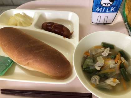 コッペパンとフランクフルトがでたので、多くの子どもがフランクフルトをパンにはさんでホットドッグにし、とても嬉しそうに食べていました。