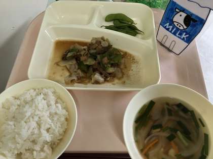 ホイコウロー 中華スープ えだまめ ごはん 牛乳