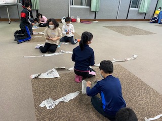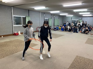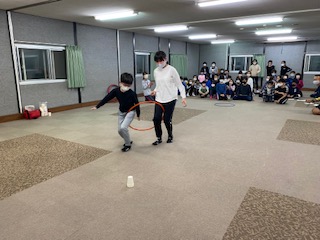 プログラム3番「よーく見てね」と4番「フープでGo」です。2人で協力してフープを運んでいます。