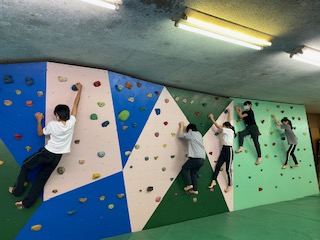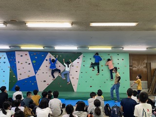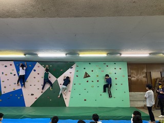 只今ボルダリングに挑戦中です。一歩一歩慎重に進み、たくさんの子がゴールできました。友達の応援にも熱が入っています。