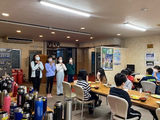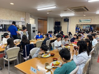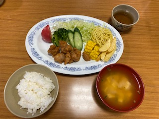 2日目夕食は、子どもたちの大好きな唐揚げ定食です。昼食のカレーをお腹いっぱい食べたにもかかわらず、夕食もモリモリ食べています。